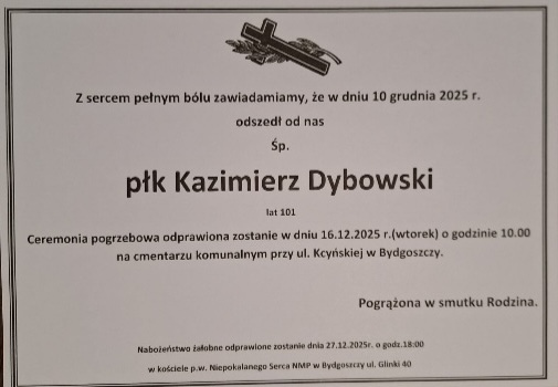 Z głębokim żalem informujemy, że w wieku 101 lat do Krainy Wiecznych Łowów odszedł nasz Kolega Śp. Kazimierz Dybowski, członek KŁ nr 56 „Żubr” w Nakle nad Notecią, założyciel Wojskowego Koła Łowieckiego KOS, Odznaczony Brązowym, Srebrnym i Złotym Medalem Zasługi Łowickiej…