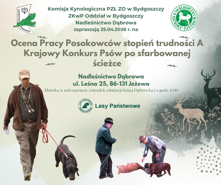 Ocena Pracy Posokowców stopień trudności A i Krajowy Konkurs Psów po sfarbowanej ścieżce odbędą się 25.04.2026 r. w Nadleśnictwie Dąbrowa, ul. Leśna 25, 86-131 Jeżewo.
