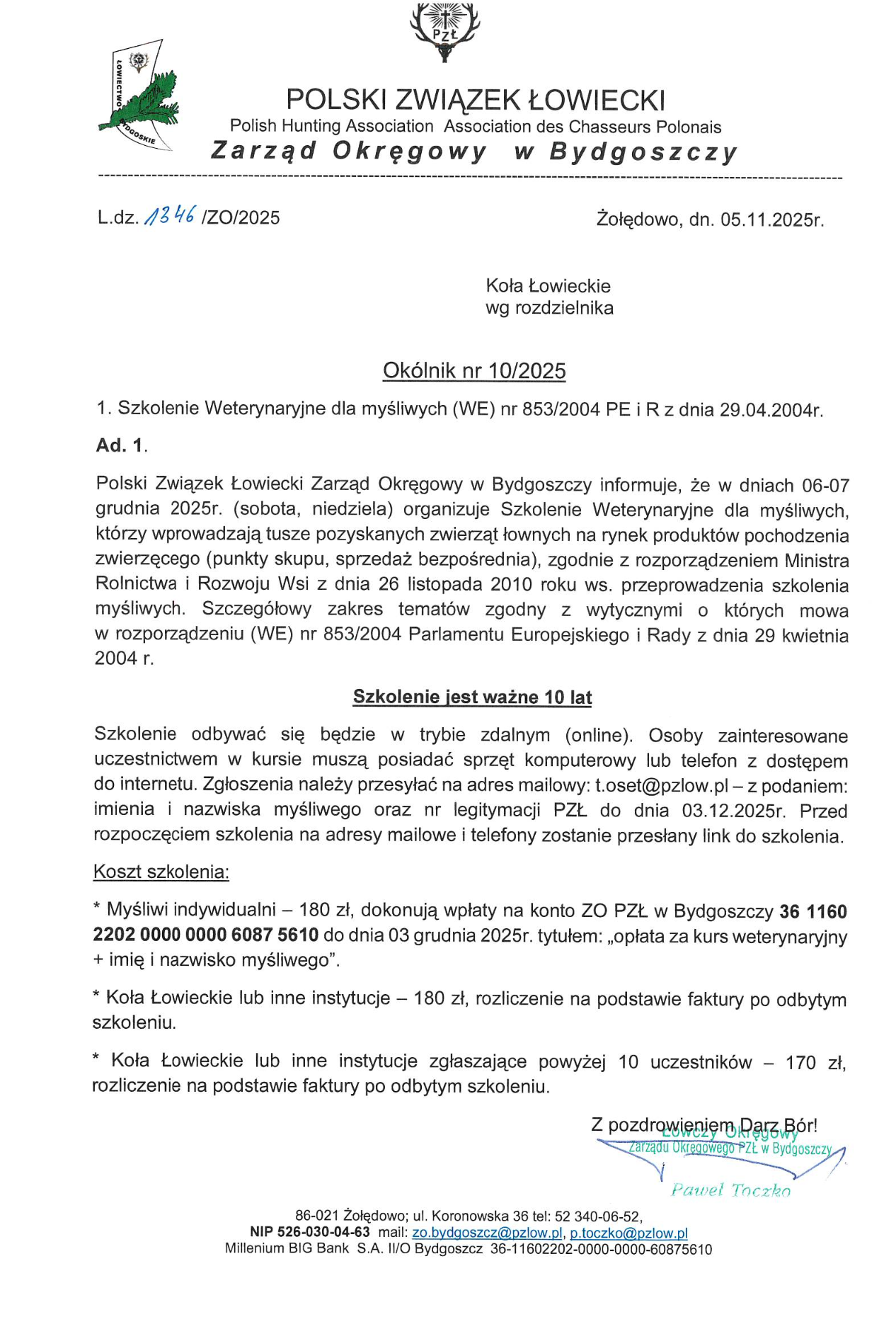 Okólnik nr 10/2025 – Szkolenie Weterynaryjne dla myśliwych w dniach 06-07 grudnia 2025r.