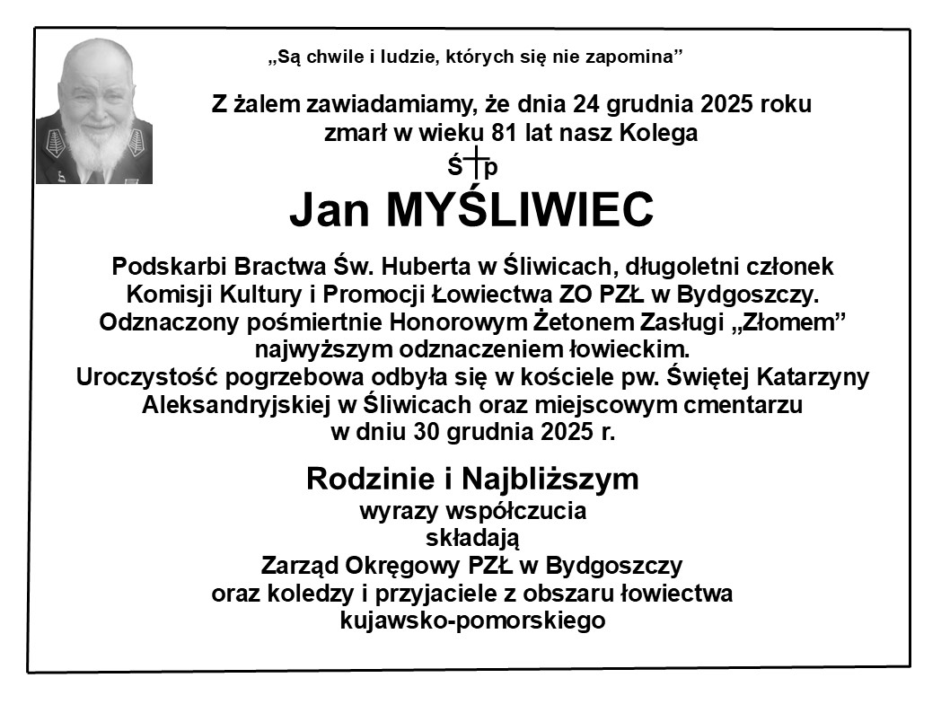 W dniu 24 grudnia 2025 r. zmarł Kol. Jan Myśliwiec, wielce zasłużony dla łowiectwa bydgoskiego i powiatu tucholskiego. Jego zasługi mają odzwierciedlenie w prasie lokalnej, m.in. Tygodniku Tucholskim oraz w kwartalniku łowiectwa kujawsko-pomorskiego „Nemrod”. Na uwagę zasługuje ufundowanie przez śp. Jana Myśliwca w 2025 r. pomnika św. Huberta w Śliwicach. Figura została ustawiona na środku ronda, któremu patronuje również św. Hubert, a odsłonięcie nastąpiło 8 czerwca 2025 r. podczas obchodów 25-lecia Bractwa Św. Huberta. To jest na pewno precedensem w skali naszego kraju.